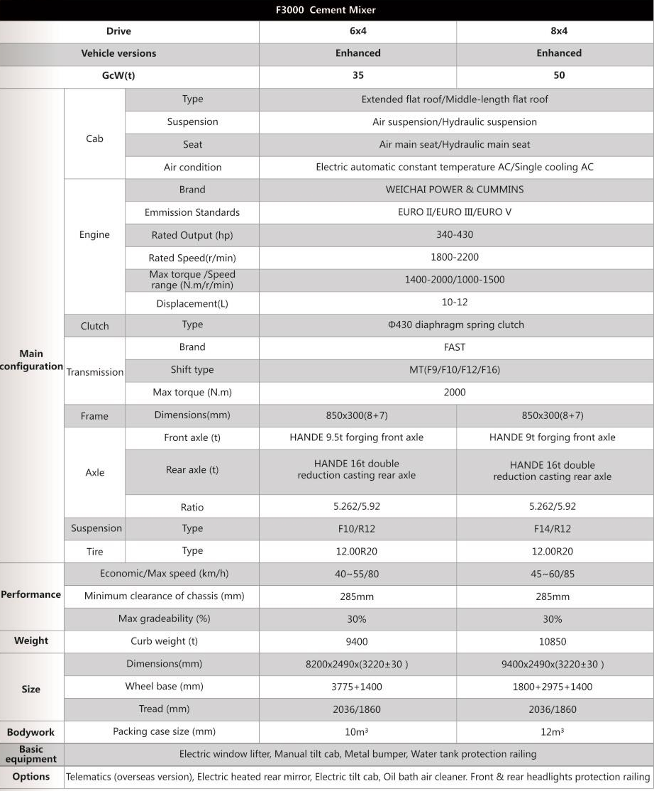 Trak ini mengamalkan casis siri F3000 Shaanxi Automobile, yang mempunyai logam lembaran pepejal dan kapasiti pemuatan yang kuat. Reka bentuk 'kepala rata' menjadikannya mudah untuk masuk dan keluar dari bandar, mengelakkan masalah kutub sekatan ketinggian. CAB dilengkapi dengan beg udara dan kerusi yang menyerap kejutan untuk meningkatkan pengalaman memandu. Tangki dan bilah pencampuran yang dipasang di atas terbuat dari keluli aloi dan bahan tahan haus, yang sangat meningkatkan hayat perkhidmatan tangki.