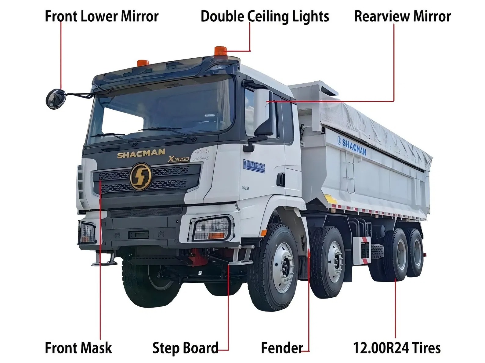 Shacman X3000 6x4 & 8x4 trak dump dilengkapi dengan enjin siri Weichai WP10 atau WP12, dengan kuasa kuda dari 340 hp hingga 460 hp, yang dapat memenuhi piawaian pelepasan Euro V atau Euro VI. Enjin mempunyai ciri -ciri kelajuan rendah dan output tork yang tinggi, kecekapan bahan api yang tinggi dan kos penyelenggaraan yang rendah. Memadankan dengan penghantaran 12 kelajuan atau 13 kelajuan yang lebih cepat, ia mempunyai kecekapan penghantaran yang tinggi dan perubahan gear yang lancar. CAB mengamalkan sistem penggantungan beg udara empat mata, yang secara berkesan mengurangkan getaran dan bunyi bising dan meningkatkan keselesaan memandu. Pelbagai saiz petak kargo disediakan, dari 5.6m hingga 9.1m, dengan kapasiti maksimum 30 meter padu, untuk memenuhi keperluan pengangkutan yang berbeza. Kenderaan ini sesuai untuk jalan raya, lombong, tapak pembinaan dan senario lain, yang merupakan pilihan yang ideal untuk industri pembinaan, perlombongan dan logistik.