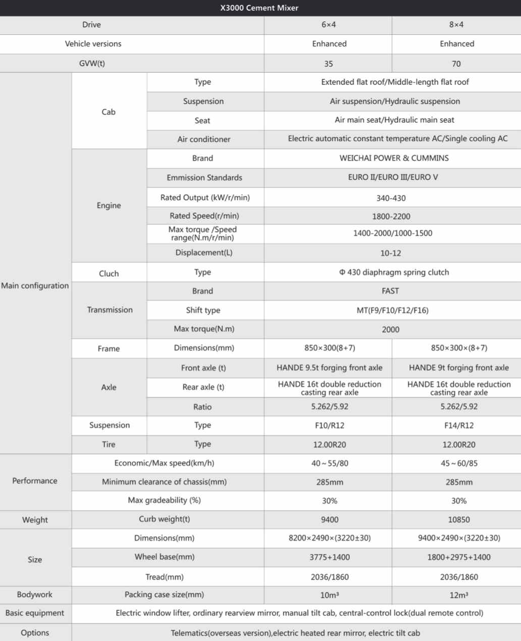 Casis dilengkapi dengan enjin Wuxi Chaiwei WP10/WP12, dengan kuasa maksimum dari 350 hingga 460 kuasa kuda. Ia dipadankan dengan transmisi 12-kelajuan FATAI dan gandar teknikal Hande Man, sesuai untuk keadaan tapak pembinaan yang kompleks. CAB mengamalkan reka bentuk penggantungan empat mata dan dilengkapi dengan kerusi penyerap kejutan udara, dengan ketara meningkatkan keselesaan pemandu. Permukaan tangki menjalani rawatan sandblasting anti-karat, dan sistem semburan pilihan boleh dipasang untuk mengelakkan konkrit daripada mematuhi. Pelepasan belakang boleh berputar 270 darjah, dan tuas operasi diatur di sebelah kanan kenderaan, memudahkan kawalan tepat satu orang. Seluruh kenderaan mematuhi piawaian pelepasan VI dan merupakan penyelesaian pengangkutan konkrit yang cekap dan mesra alam untuk projek pembinaan bandar.